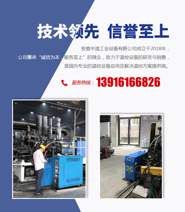 安徽中溫工業(yè)設(shè)備有限公司成立于2018年,公司秉承“誠(chéng)信為本,服務(wù)至上”的理念,致力于溫控設(shè)備的研發(fā)與銷售,是國(guó)內(nèi)專業(yè)的溫控設(shè)備應(yīng)用及解決溫控方案提供商。